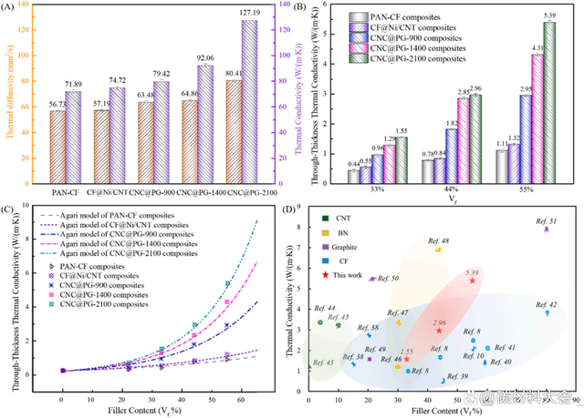 图5 PAN-CF、CF-Ni/CNT、CNC@PG-G及其复合材料的导热性能