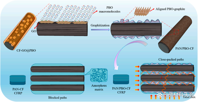 中国科学院宁波材料技术与工程研究所碳纤维及其复合材料团队在张永刚研究员带领下开展了聚丙烯腈(PAN)基高强高模碳纤维国产化技术的基础研究工作,总结出了诱导三维有序石墨结构形成的关键技术(Journal of Raman Spectroscopy, 2019, 50, 655; Composites Part B: Engineering, 2019, 164, 476; Composites Part A: Applied Science and Manufacturing, 2019, 119, 21等),这为高导热高性能碳纤维的制备和生产提供了理论指导。针对碳纤维复合材料受高热阻树脂基体阻隔及碳纤维各项异性影响所致的厚度方向导热系数较低的问题(一般不超过1 W/(m·K)),团队利用刚性棒状聚合物聚对苯撑苯并双噁唑(PBO)更易石墨化的结构特点,设计了复合基碳纤维的制备策略,得到了具有更高取向度、结晶度的PBO衍生石墨结构,该结构对高导热碳纤维及其复合材料的制备至关重要。