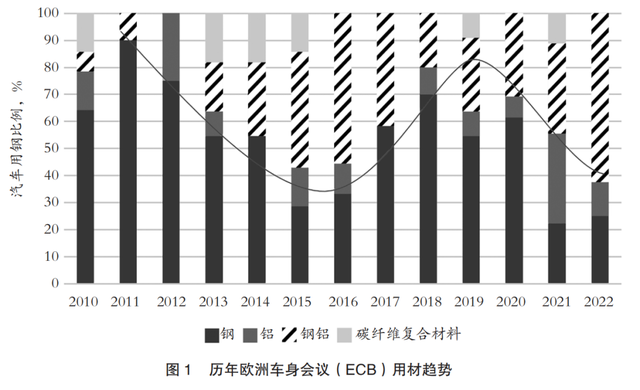 国际先进车企在朝着多材料整车集成应用方向迈进,汽车用钢比例呈现先下降后上升并趋于稳定的趋势(图1),主要是随着铝合金、碳纤维复合材料应用比例增大,对成本控制和制造要求更严格,所以逐渐转向对钢材的应用,并通过提高高强钢的强度级别实现成本与重量的精益平衡,最终形成与铝/复合材料集成并用态势。而国内多数车企处于从先进高强钢应用为主向钢铝混合应用方向转变的阶段,对于复合材料、镁合金应用也较为单一。伴随着近年来国产汽车不断冲击高端车型市场的进程,铝/镁/复合材料应用比例也在不断爬升。
