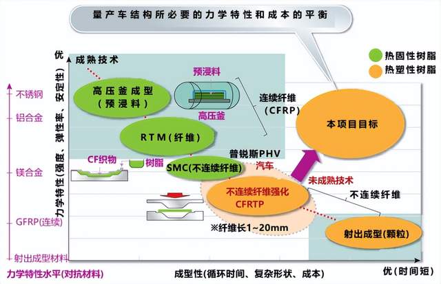关于碳纤维增强热塑性复合材料,2014年丰田汽车将其应用在燃料电池车MIRAI的堆栈框架上,这也是首次在量产车上的应用。关于CFRTP其他的应用事例目前仍在研究阶段还没有达到实用化(图1)。