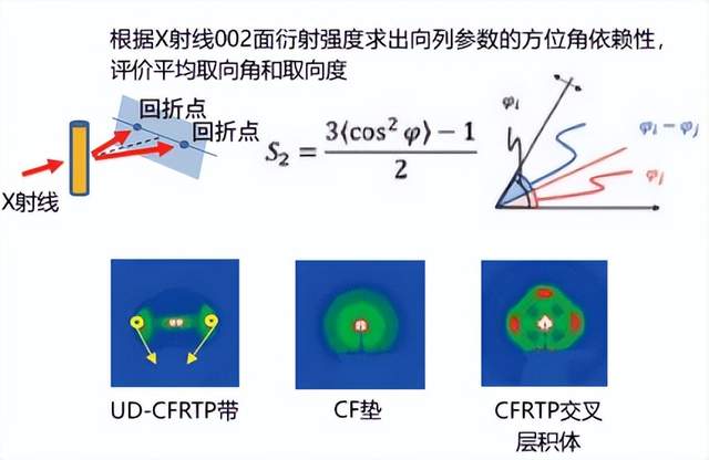 关于材料的检测评估技术,申请了两项专利。其中一项专利是关于预填充物的制作方法,开发了多阶段稀释法的纤维长度分布测定法,实现了排除试样采集位置特异性的精度提高和效率化(图5)。另一项专利是测量纤维方向的方法,开发了X射线衍射法的纤维取向测定法,确立了平均取向角和取向顺序参数的计算顺序(图6)。