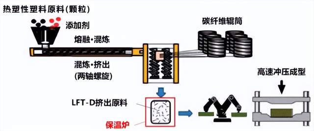 日本5家汽车制造商为了寻求适用于量产车生产的CFRP制造技术,将目光着眼于LFT-D(长纤维增强热塑性复合材料工艺)工艺技术(图2),并于2012年在日本经济产业省的支持下成立了研发团队,由名古屋大学国家复合材料中心石川隆司教授担任项目负责人,之后该项目在2014年并入NEDO(日本新能源技术开发机构) 的“创新新结构材料研发”项目。