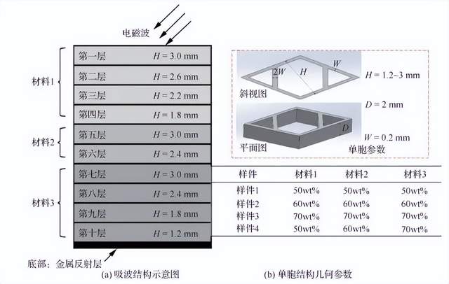 中南大学团队采用选择性激光烧结增材制造工艺(SLS)制作了一种三层不同单元的均质材料吸波结构,试验表明其在4~18GHz均低于频率-10dB。南京航空航天大学团队使用多材料数字光投影技术对石墨烯/羰基铁/聚甲基丙烯酸甲酯烯等复合材料进行打印,制造了一种具有双层结构的吸收体,通过控制双层结构的厚度,可以实现吸波性能的调节,通过优化得到最小反射损耗为-46.1dB, 有效吸收带宽为3.5GHz。