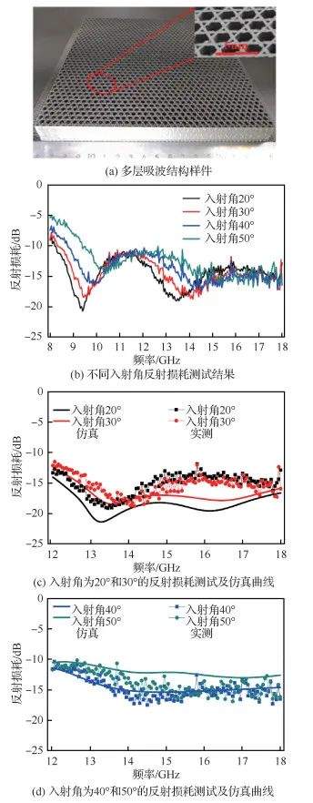 图14为打印完成的多层吸波结构试样及在不同角度入射电磁波下的反射损耗曲线测试结果。测试结果显示,随着电磁波入射角度从20°增加到50°,多层吸波结构反射损耗曲线逐渐向上移动,吸波性能逐渐下降。图14(c)和图 14(d)显示,当入射角分别为20°和30°时,实测反射损耗值曲线较仿真结果整体向上偏移;当入射角分别为40°和50°时,实测反射损耗值曲线较仿真结果整体向下偏移;这主要是由于3D打印精度误差导致了在不同入射角度下特征阻抗发生变化,从而引起吸波效果与仿真结果的差异。最终可以得出结论,当电磁波入射角度分别为20°、30°、40°、50°时,多层级梯度吸波结构的有效吸波(<-10 dB)频宽分别为9.8 GHz(8.2~18 GHz)、9.65 GHz(8.35~18 GHz)、9.25 GHz(8.75~18 GHz)、8.6 GHz(9.4~18 GHz)。