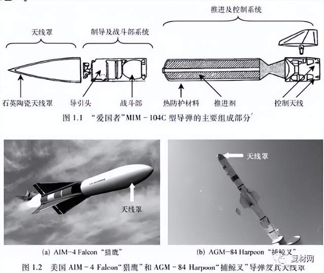 航天透波材料是一种保护航天飞行器在恶劣环境中通信、遥测、制导、引爆等系统正常工作的多功能介质材料,在运载火箭、空天飞机、导弹及返回式卫星等领域有着广泛的应用。天线窗和天线罩是两种常见的航天透波材料结构件,如图1.3所示。其中,天线窗一般位于飞行器的侧面或者底部,采用平板或带弧面的板状结构,是飞行器电磁传输和通信的窗口,对飞行器的飞行轨迹控制及跟踪至关重要。天线窗的位置通常不会处在最恶劣的热力环境中,因此相对于天线罩,其对性能的要求并不十分严苛。天线罩位于导弹头部,多为锥形或半球形,它既是弹体的结构件,又是无线电寻的制导系统的重要组成部分,是一种集承载、导流、透波、防热、耐蚀等多功能为一体的结构/功能部件。