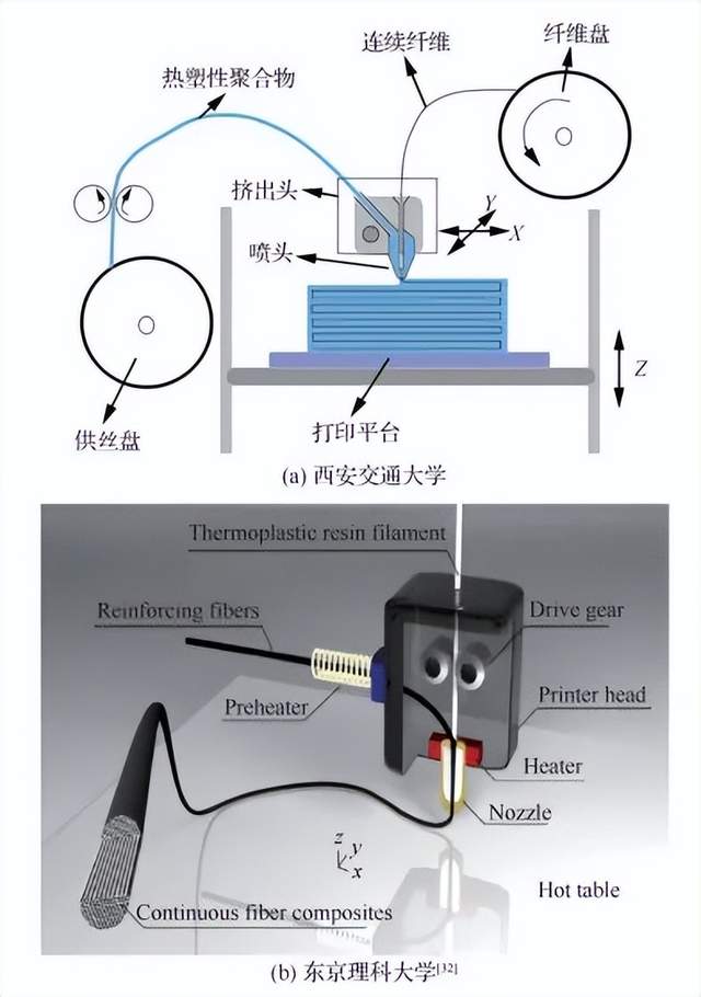 该技术在传统材料挤出成形工艺(ME)基础上创新发展起来的,根据原材料与打印方式的不同主要包括连续纤维预浸丝3D打印与连续纤维干丝原位浸渍3D打印两种不同的形式。
