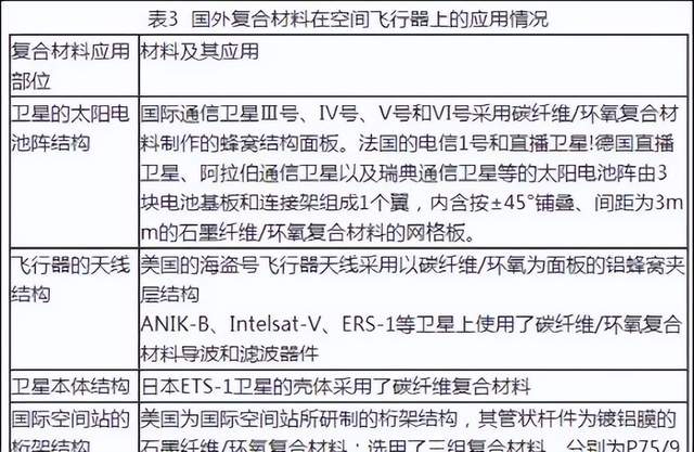 此外,国外以复合材料取代金属制造空间飞行器(卫星、空间站、航天飞机等)构件目前已取得一定程度的应用。表3是国外复合材料在空间飞行器上的一些应用情况[18~20]。