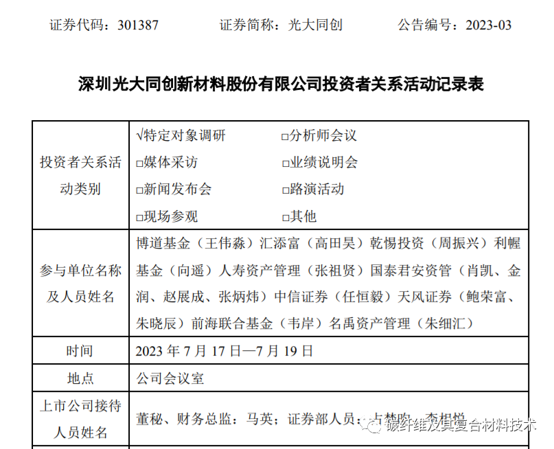 7月17日到19日,光大同创在接受投资方调研时简要介绍了公司碳纤维业务的发展历程,并分析了未来碳纤维在消费电子领域发展趋势: