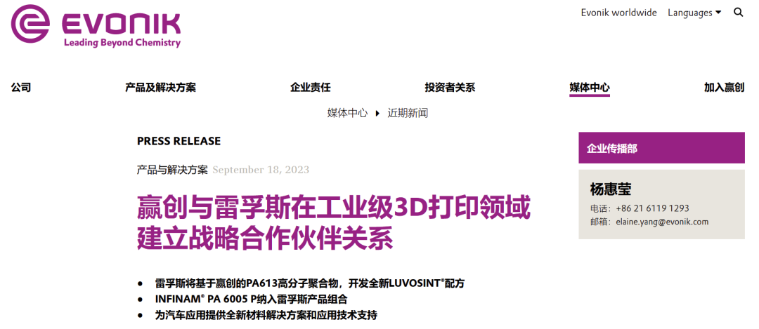 其中雷孚斯将基于赢创PA613聚合物,以自有LUVOSINT®品牌开发3D打印配方。此外,自2023年9月1日起,赢创INFINAM® PA 6005 P(PA613)聚合物粉末将纳入雷孚斯的产品组合。