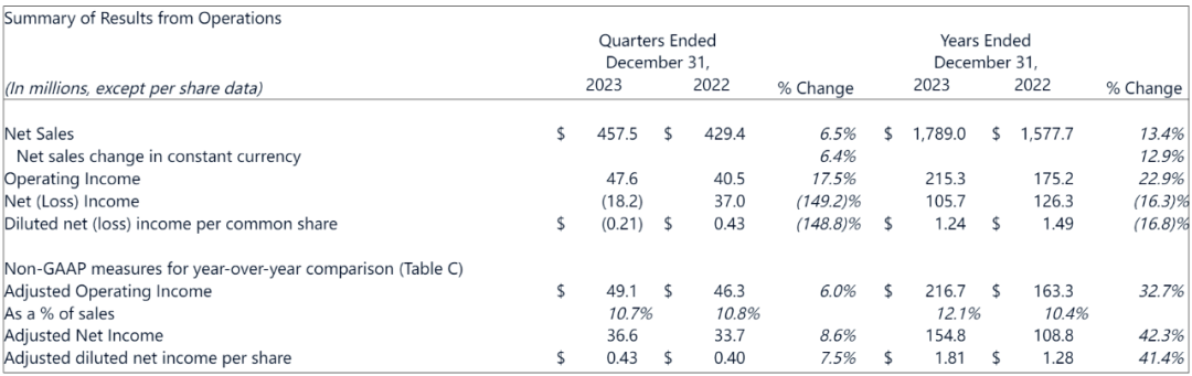 2023年全年,销售额为17.89亿美元(约128.4亿元人民币),而2022年的销售额为15.777亿美元,增长了13.4%。调整后营业收入为2.167亿美元,毛利率为24.2%。其中: