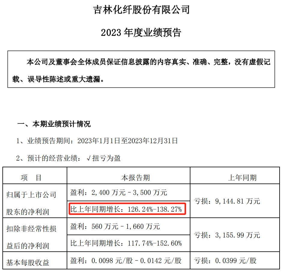 由亏转盈!吉林化纤2023年净利润涨幅超100%