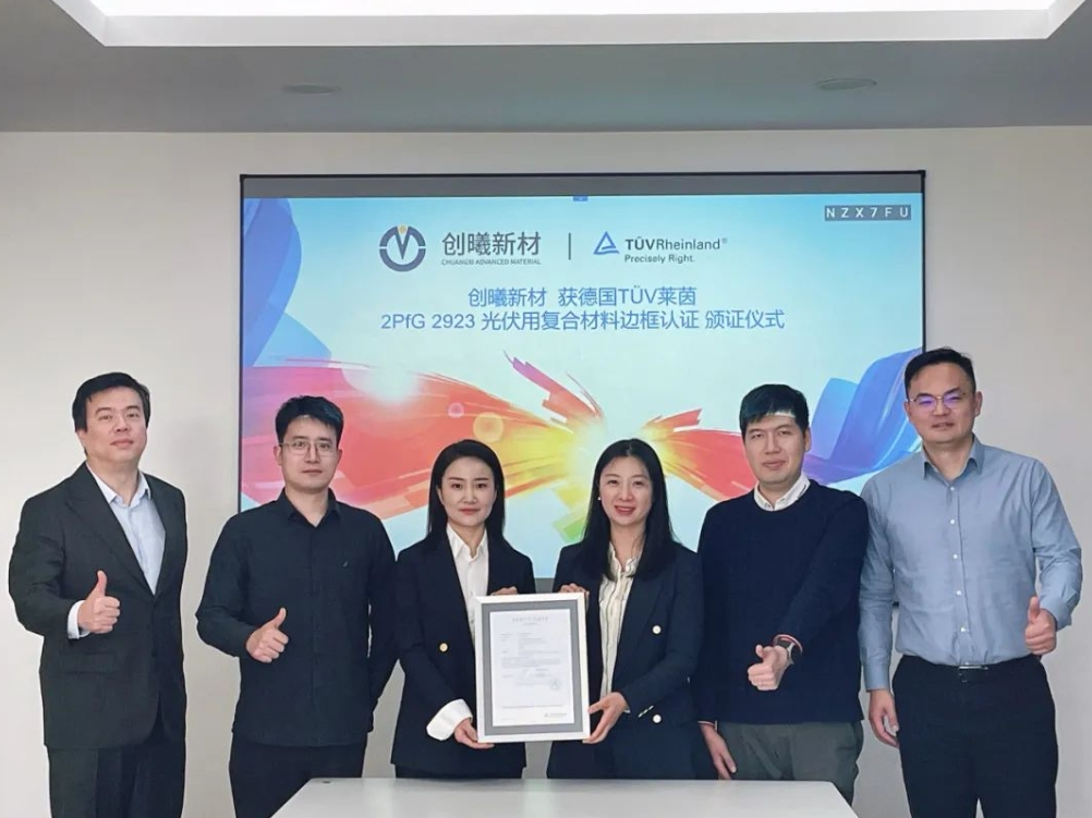 “非常感谢TÜV莱茵!创曦新材能够获得TÜV莱茵颁发的光伏用复合材料边框产品认证证书,我们感到非常荣幸,这代表着TÜV莱茵对我司研发技术及生产能力的重要肯定。