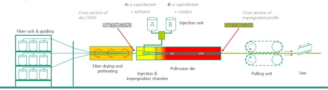 ε-己内酰胺的粘度非常低(约10mPa*s),确保了增强纤维的最佳浸渍。通过调节市售材料中活化剂和催化剂的浓度,可以控制聚合速率,从而实现高拖运速度和经济高效的生产。基质的阴离子聚合与选定的纤维相结合,在基质和纤维之间形成化学键,从而产生与热固性基质相当的性能。基质改性也可以使用添加剂,如着色剂和阻燃剂。