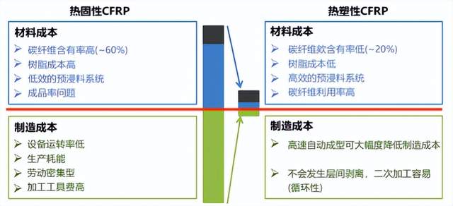 图 热固性CFRP和热塑性CFRP的成本比较(来源:前言材料)