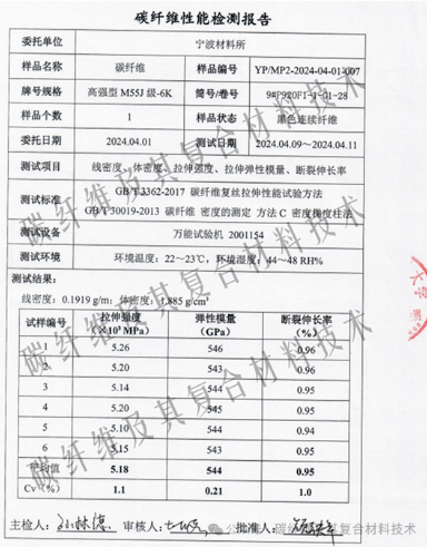 2016年1月,宁波材料所碳纤维团队在国内率先突破国产M55J级高强高模碳纤维关键制备技术,随后经过技术验证、批量稳定化制备、预浸工艺评价等,逐渐形成了自主牌号CNIQM55(M55J级)高强高模碳纤维产品,该型碳纤维在拉伸模量与国外同类型纤维相同的情况下,拉伸强度达到4.30GPa、略高于国外同类产品的4.02GPa。随后CNIQM55碳纤维实现了在临近空间无人机上的应用。