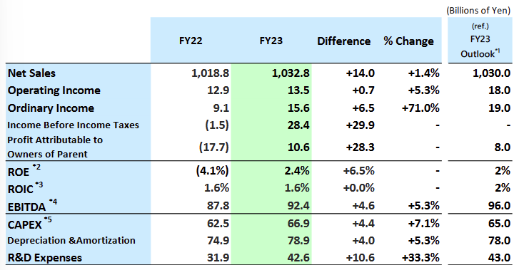 树脂和塑料业务:主要产品聚碳酸酯树脂的销量保持在2022财年的水平,主要是由于中国经济低迷和欧洲经济放缓导致需求疲软。此外,由于原材料价格下降和销售结构恶化,销售价格下降对营业收入产生了影响。