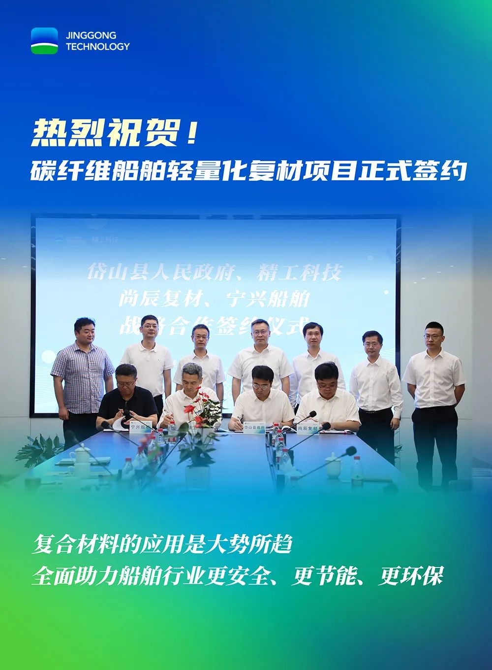 6月28日,碳纤维船舶轻量化复合材料项目在浙江绍兴正式签约。岱山县人民政府、浙江精工集成科技股份有限公司(简称“精工科技”)、尚辰(浙江绍兴)复合材料科技有限公司(简称“尚辰复材”)、舟山宁兴船舶修造有限公司(简称“宁兴船舶”)共同签署战略合作协议。