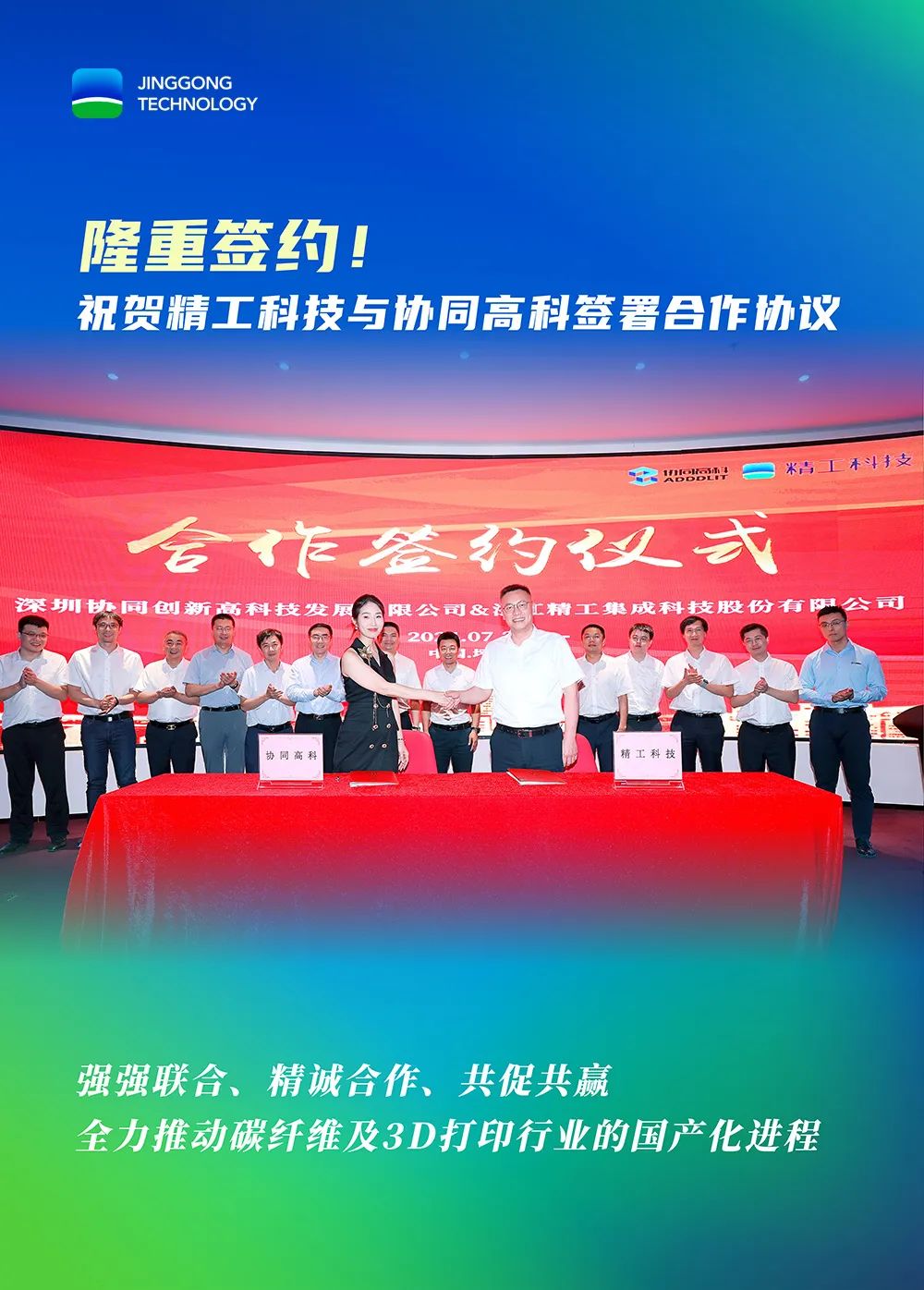 此次签约标志着精工科技在推进碳纤维复合材料项目进程中又迈出了坚实一步。下一步,双方将全力调配资源共享、优势互补、紧密合作,全力推动碳纤维及3D打印行业的国产化良性发展进程,进一步引领和推动技术的应用实施,为打开高端材料及装备技术国产化的新格局注入强劲活力。