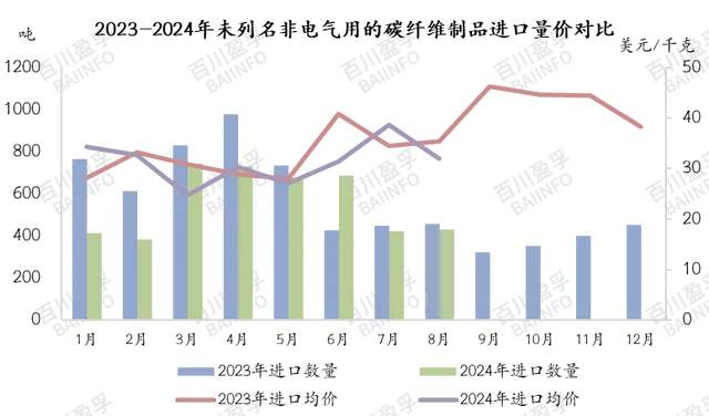 2024年8月未列名非电气用的碳纤维制品进口总量430.427吨,同比减少5.9%,环比增加2.25%。其进口主要来自日本和中国台湾,进口数量分别为225.296吨和164.701吨。未列名非电气用的碳纤维制品进口均价为31.99美元/千克,其中日本进口均价为27.58美元/千克。