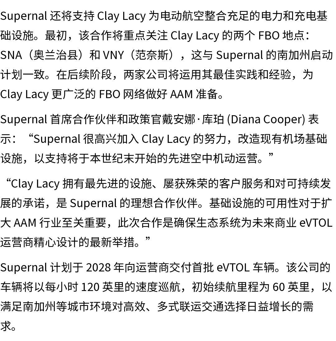 作为五年合作的一部分,Supernal 和 Clay Lacy 将制定端到端运营计划,将 AAM 整合到现有机场基础设施中,重点制定地面处理、MRO 和电池管理的标准和程序。