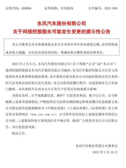 2月9日,长安汽车和东风汽车集团分别发布公告称,其间接控股股东正在与其他国资央企集团筹划重组事项。