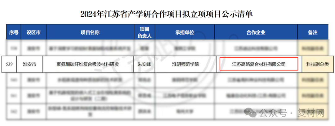 江苏高路复材“聚氨酯碳纤维复合吸波材料研发”项目入选2024年江苏省产学研合作立项名单