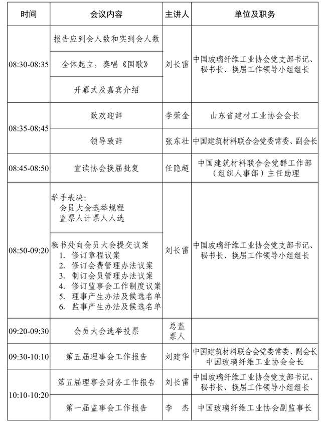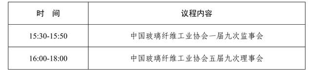 中国玻璃纤维工业协会第六次会员大会及六届一次理事会、二届一次监事会议程安排(12月25日08:30-12:30 三层宝盛1厅)