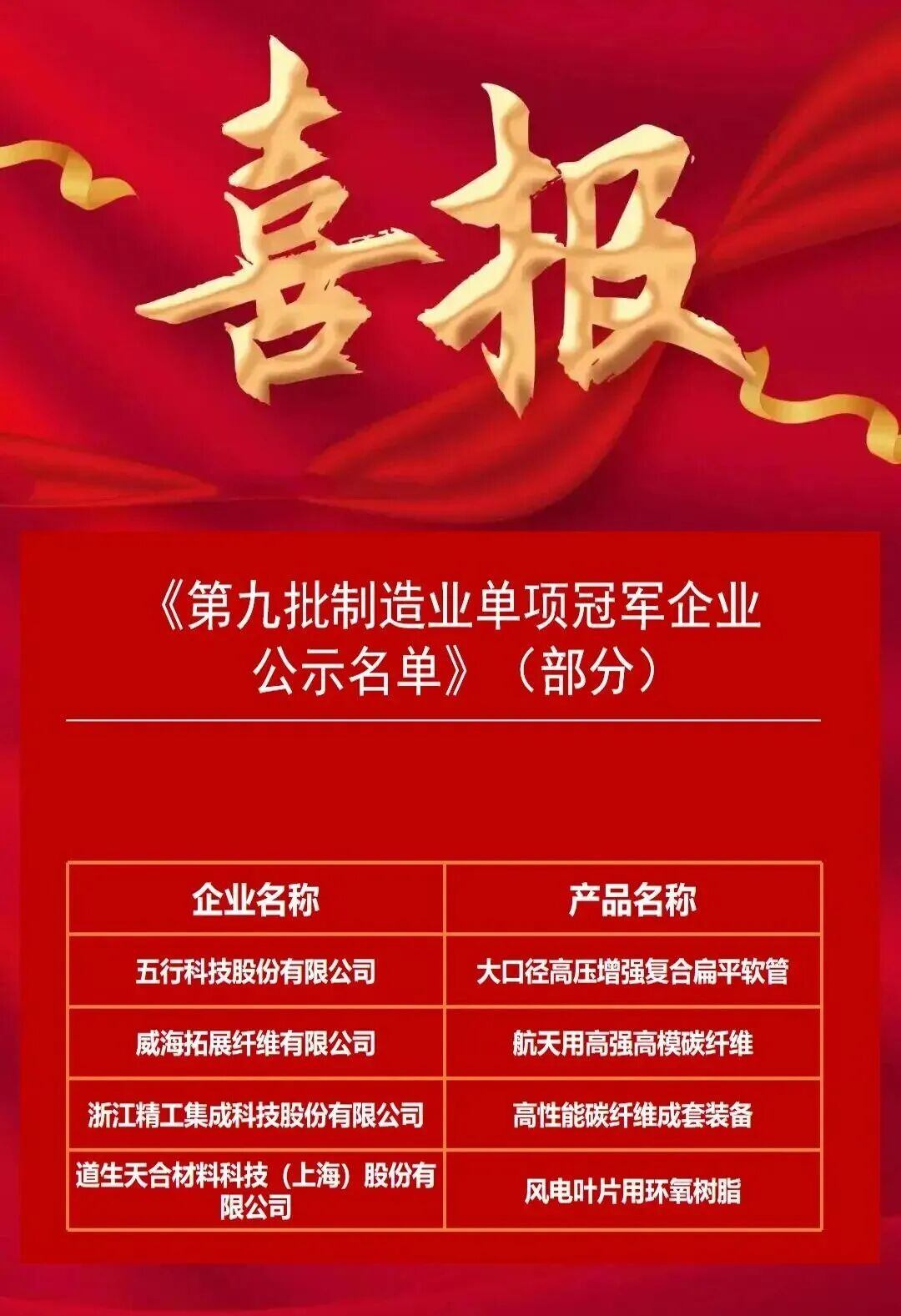 日前,第九批国家级制造业单项冠军企业公示名单发布,涉及复合材料行业的4家企业成功入选。