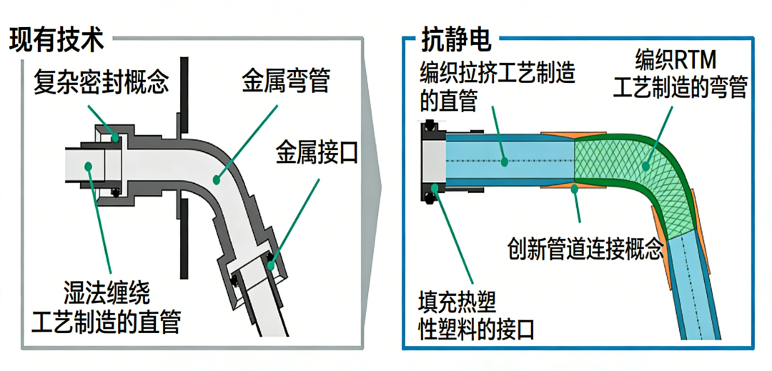 德国联邦轻量化技术转移计划项目 项目名称:AntiStatic -用于多个行业低压和高压应用中的流体输送的高刚性防静电复合管道系统 项目资助时间:2021年6月1日 – 2024年6月30日 资助金额:130万欧元 背景 在航空领域,燃油、液压和通风管路系统至关重要。目前,这些系统大多由金属制成,导致重量大且设计自由度有限。复合材料在此领域具有巨大的潜力:它们更轻、更耐腐蚀,并提供了更大的设计自由度。 但它们目前还不能满足所有要求,特别是在导电性和复杂管道几何形状的经济制造方面。在功能、安全性和效率的组合方面,现有的解决方案已经达到了极限。AntiStatic 研究项目正是从这里出发,寻求新的技术解决方案。 目标 项目团队计划开发由复合材料制成的抗静电管道系统,以取代传统的金属管道。该创新产品的特点在于轻量化、高机械稳定性和导电性。管道将包括直段和弯段,以满足航空业的特定要求。 该项目侧重于节约资源的生产和管道系统的模块化设计。采用这项技术可实现高达 50% 的重量减轻,从而大幅减少航空业的二氧化碳排放量。 路径 项目团队将编织拉挤成型和编织树脂传递模塑(RTM)工艺相结合。编织拉挤成型可生产出直管,通过连续生产,这些直管特别稳定且轻便。弯曲管段采用编织树脂传递模塑工艺,该工艺可制造出复杂的几何形状。 此外,研究人员还开发了一种填充碳纳米管(CNT)的树脂系统。该系统赋予部件抗静电特性,且不会影响其机械特性。该团队采用模块化连接工艺将各个管段连接在一起。研究人员现在使用一个演示器来证明所开发技术的实用性和效率。