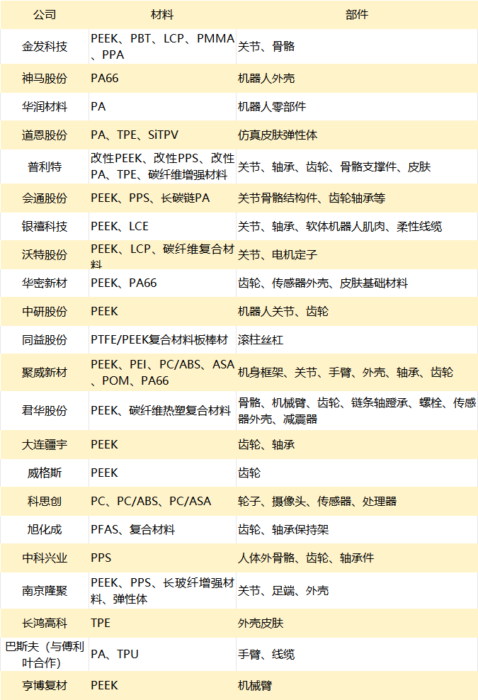 与此同时,以PEEK为代表的高性能工程塑料在人形机器人领域加速渗透。该类材料具有极低密度、高强度、耐磨性、高温稳定性、良好成型性等优势,可代替金属材料使用。当前,人形机器人常用的工程塑料包括PEEK、PA、PPS、PC/ABS、UHMW-PE等,可应用于关节连接件、传动组件及轻负载结构件等场景。未来随着成本下降与加工技术成熟,工程塑料在人形机器人中的应用和市场规模将进一步增长。