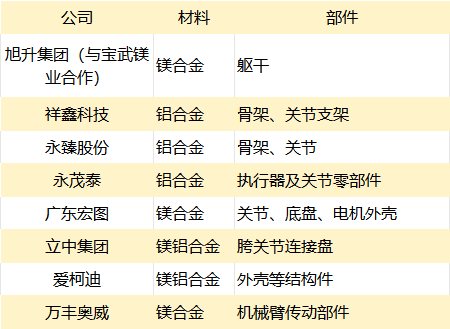 镁铝合金是人形机器人结构设计中最核心的轻量化金属材料。铝合金密度约为2.6-2.9 g/cm³,兼具较高强度、良好的加工性、导热性和耐腐蚀性,广泛应用于人形机器人机身外壳、框架及承载结构。众擎人形机器人SE01、宇树科技G1、波士顿动力Atlas等均采用高强度铝合金作为关键结构支撑。镁合金的密度仅为1.8 g/cm³,其比强度、比模量优于铝合金,因此在对重量敏感的部件中具备更大潜力。特斯拉Optimus和优必选Walker系列在关节和传动结构中已引入镁合金。当前,部分应用场景已呈现“镁代铝”的发展趋势。