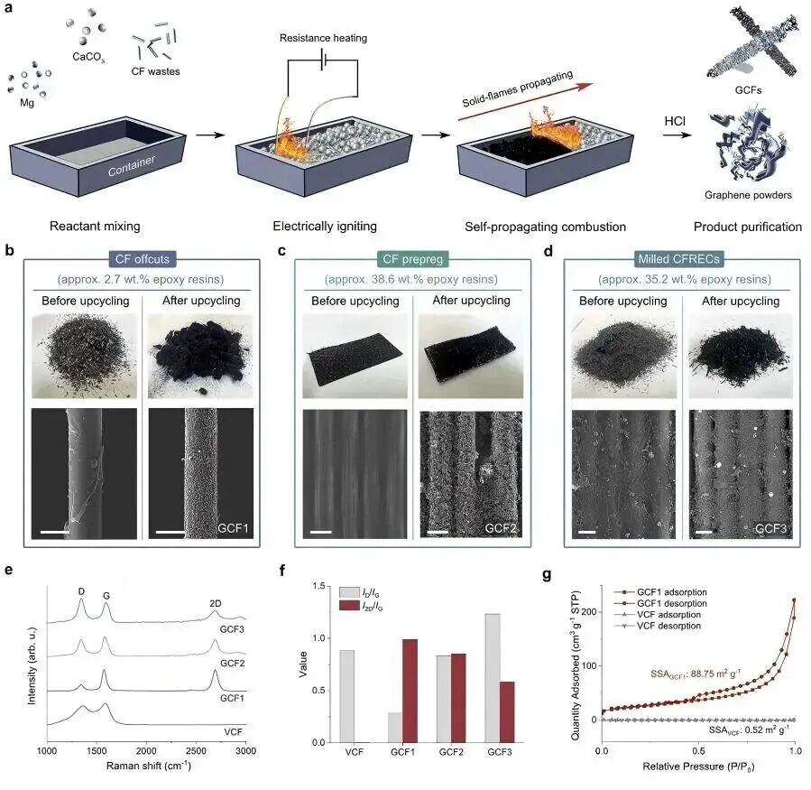 随着碳纤维增强环氧树脂复合材料在航空航天、风电等领域的广泛应用,其生产废料及报废制品数量增加。如何实现碳纤维废弃物的高效、高值化回收利用已成为难题。针对这一挑战,研究团队创新性地利用镁粉和碳酸钙粉末作为反应物,基于自蔓延高温合成技术,实现在固态火焰中对碳纤维废弃物的快速升级回收。研究证实,该技术能将碳纤维边角料、预浸料及复合材料等多种废弃物成功转化为石墨烯接枝碳纤维和石墨烯粉末,且所得产物在增强石墨材料和电磁干扰屏蔽等领域具有广阔应用前景。