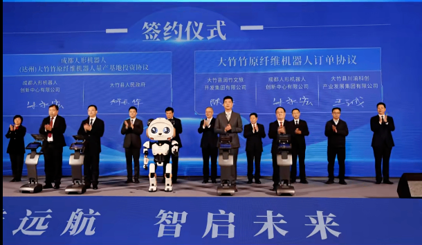 成都人形机器人创新中心与大竹县相关单位现场签署两项关键协议——《成都人形机器人(达州)大竹竹原纤维机器人量产基地投资协议》与《大竹竹原纤维机器人订单协议》,标志着总投资3亿元的合作项目正式进入实施阶段。