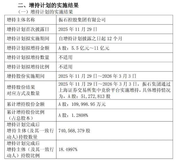 截至本公告日,振石集团以自有及专项贷款资金采取集中竞价交易方式累计增持公司股份51,272,813股,占公司总股本的1.2808%,累计增持金额为109,998.95万元,达到增持计划的下限要求,本次增持计划已在增持期限内实施完毕。