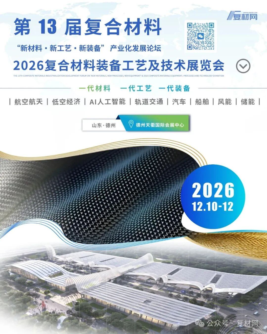 为精准对接“十五五”政策导向,落实产业链强链、补链要求,推动“新材料、新工艺、新装备”与智能智造技术的协同迭代与产业化落地,助力多元复合材料与配套工艺、装备的协同创新发展,实现 “一代材料・一代工艺・一代装备” 的高质量发展目标,复材网在成功举办十二届会议基础上,决定于2026年12月10日-12 日在山东・德州天衢国际会展中心举办第 13 届复合材料“新材料・新工艺・新装备” 产业化发展论坛暨2026复合材料装备工艺・技术展览会。
