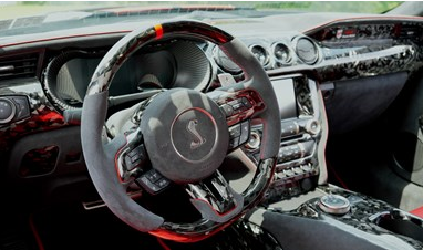据悉,这款2021款谢尔比GT500赛道套件版原厂已配备以碳纤维为核心的硬件配置,包括碳纤维陶瓷轮毂和大型碳纤维后扰流板。这一先天优势,让其成为开展全面内饰材料升级的理想平台,而非仅能进行局部饰件的简单优化。