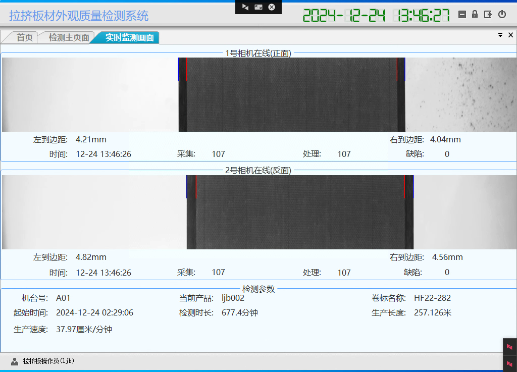 ▷多角度光源和相机配置,实现拉挤板正反面同时检测。可以精准识别微小至4mm²的正、反面缺陷,以及肉眼难以察觉的细微尺寸偏差,系统会用红色方框准确框出缺陷的位置,同时用红线和蓝线标记出拉挤板的边缘和到边距离,脱模布到边距检测精度为0.5mm,界面可设置到边距报警阈值,方便用户快速定位缺陷并了解其与拉挤板边缘的相对位置关系。