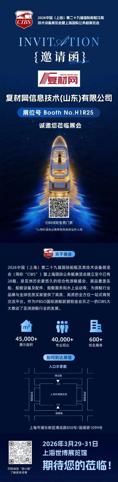【邀请函】复材网(展位号:H1R25)邀您共赴2026上海CIBS国际船艇展,共探船艇复合材料新机遇