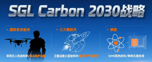 在完成碳纤维业务盈利修复后,SGL Carbon在2025财年报告中正式发布“SGLC Growth 2030”长期战略,提出“2030年重回十亿欧元营收规模,打造高盈利特种材料产品组合”的核心目标。其中,完成重构的碳纤维及复合材料业务,成为集团除特种石墨业务外锚定未来的第二增长曲线。在该战略中,SGL Carbon为碳纤维业务锁定三大全新高增长赛道,跳出传统汽车与工业市场内卷:国防与安全领域,依托汽车复合材料轻量化、高抗冲击技术,拓展军用无人机结构件、军用车辆轻量化部件等应用场景,目前已启动产品研发与资质认证;航空航天领域,凭借现有航空级认证碳纤维材料体系,向航天领域延伸,重点开发卫星运载火箭结构件、重返大气层热防护罩等所需的耐高温、耐高压复合材料;核能装备领域,借助与美国SMR技术龙头X-energy的长期合作,聚焦碳纤维复合材料在核反应堆隔热、结构支撑等环节的应用,实现特种石墨与碳纤维业务的协同拓展。