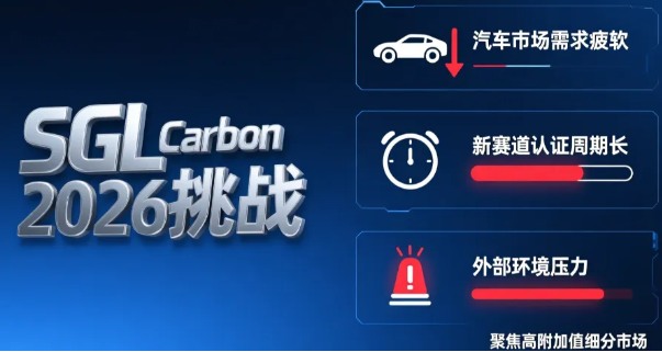 尽管碳纤维业务已实现盈利反转,但SGL Carbon在财报中坦诚,2026年该业务仍将面临多重挑战,增长兑现尚需时间。核心下游市场需求疲软将持续,作为最大下游的汽车行业,2026年欧美市场预计增长乏力,叠加美国进口汽车关税壁垒、亚洲复合材料企业低成本竞争,将持续压制汽车用复合材料订单需求,财报预测合并后的FC业务单元2026年营收将较2025年CF与CS业务合计营收显著下滑;新增长赛道商业化仍处于早期阶段,核能、国防、航空航天领域产品认证周期长、资质壁垒高,2026年仅能带来极低营收贡献,业绩支撑需等到2027年及以后。此外,地缘政治冲突、欧洲能源价格波动、供应链中断风险,以及欧盟严苛环保监管带来的生产成本上升,加之全球碳纤维市场竞争加剧,东丽、赫氏等国际巨头占据高端市场主导地位,中国碳纤维企业快速崛起挤压中端市场空间,均对业务发展构成持续压力,聚焦小众高附加值细分市场成为其唯一生存选择。