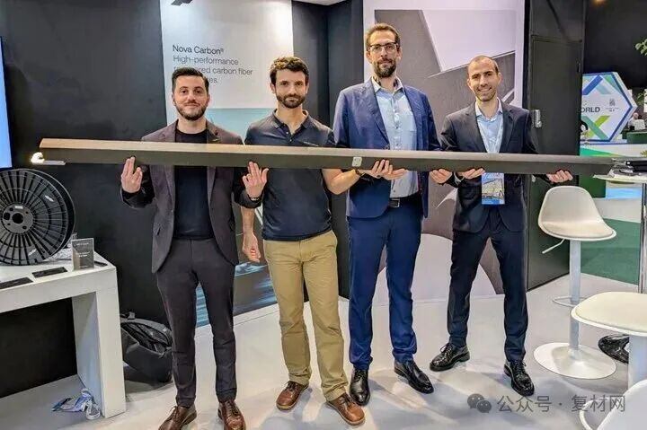 合作方在2026 年 JEC 世界复合材料展上重点展示了这款回收碳纤维拉挤横梁。从左至右依次为:文森特・甘博亚(Nova Carbon 联合创始人)、亚历山大・吕尔(Epsilon Composite 副首席执行官)、安布鲁瓦斯・拉特龙(Epsilon Composite 研发总监)以及雨果・卡尔特龙(Nova Carbon 联合创始人)。来源 | Epsilon Composite