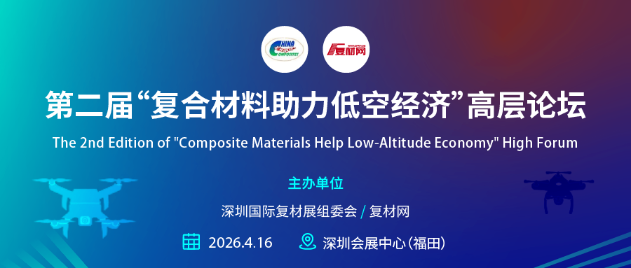 第四届深圳国际复合材料工业技术展览会将于2026年4月15-17日在深圳会展中心(福田)盛大举办。本届展会预计将汇集超过200家行业知名企业参展,吸引近10,000名全球专业观众到场交流。作为展会重磅同期活动,组委会将携手行业知名媒体“复材网”,于4月16日举办第二届“复合材料助力低空经济”高层论坛。本届论坛的主题是“复合材料低成本制造如何支撑规模化发展”,将重点探讨产业规模化发展的核心瓶颈,旨在推动材料端与应用端的协同创新与降本突破。
