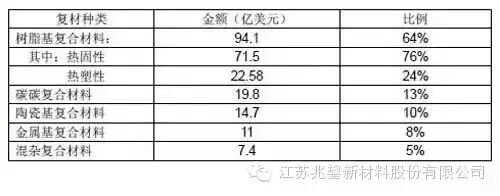 本表是根据我们统计的碳纤维需求吨数,根据纤维在树脂中通常的65%的比例计算的。其目的是给大家一个复合材料需求的规模概念。