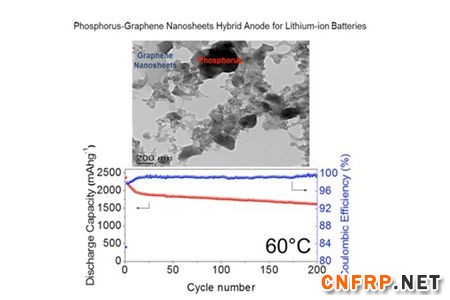 针对这一问题,近美国宾夕法尼亚州立大学(The Pennsylvania State University)王东海教授领导的,以于昭新、宋江选为主的科研梯队发明了一种新型锂离子电池负极材料:“红磷-石墨烯”纳米复合材料。该种材料是由红磷和石墨经球磨制备得到。红磷化学稳定性高,廉价易得,而且环境友好。其作为锂离子电池负极材料的理论容量可达2600 mAh/g,7倍于商用石墨电极。 石墨/石墨烯因其极高的电子电导率被引入到该体系中以提升纳米复合材料整体的电子电导率。在高速球磨过程中,微米级的红磷颗粒被打碎至纳米级。石墨在球磨 过程中剥离为大比表面积的石墨烯。经过长时间机械力作用,石墨烯相互搭接形成一个紧密结合的三维导电网络,而纳米级红磷颗粒均匀分散在该网络中。红外光谱 (Infrared Spectroscopy)测试显示,红磷和石墨烯以“磷-氧-碳 (P-O-C)”的化学键形式结合在一起,这又为该材料出众的电池性能提供了保证。在室温下,该纳米复合材料的放电容量可达1400mAh/g,4倍于现行商用化锂离子电池负极材料–石墨。 经过300周的循环,放电容量仍然能保持在60%以上。高温环境(60°C)对于现行商用锂离子电池仍是很大的挑战。而该种材料,在60°C下,放电容量可进一步提升至1650mAh/g。经过200周循环,放电容量保持率可在70%以上。