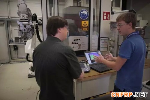 图为通用研究中心的马赛厄斯·梅斯默(右)站在碳纤维自动放置机器人前。