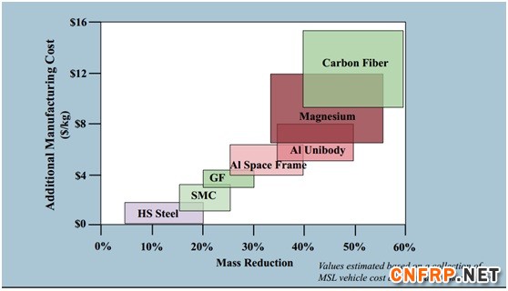 这张图的横坐标是减重效果,而纵坐标是替换之后带来的成本。很显然,大致有一个规律:减重效果好的代价也相对较大。下边的是高强钢,成本基本不上升,不过减重效果一般。上边的是碳纤维,虽然减重效果是杠杠的好,但是每公斤成本要增加100来块!