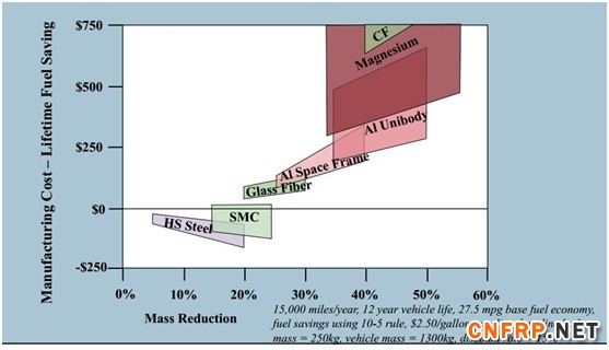 这张图的横坐标是各种轻量材料的减重效果,纵坐标是成本减去节省的油钱,也即净成本。它是以这样的标准来计算的:车重1300千克,27.5每加仑英里的油耗(大约8.6L每百公里),12年的使用寿命,每年跑1500英里,利率15%。按这么个算法,目前也就使用高强钢能够赚回来一点,其他的都是亏本生意。