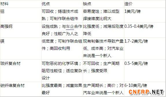 并且,再退一步讲,即使是不差钱,轻量化也远不是只将钢铁材料换成轻的材料那么简单。下面是部分轻量材料的优劣势对比表: