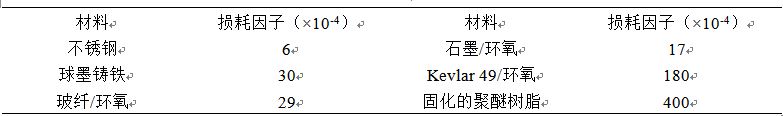 (6)纤维增强复合材料良好的隔震阻尼性能,由于高速动车组轻量化的发展,随之而来的轨道交通工具的宽频振动及噪声越来越严重,振动过大时不仅影响乘车的舒适性,严重时将直接导致零部件的失效,造成行车事故。考虑到金属材料的低阻尼性及降噪设计的复杂性,大量组合设计的纤维增强复合材料应用在车体夹层、车体底部、发动机等部位来降低车体的振动及噪音。表2是不同材料阻尼影响因子参数,从图中可以看出与金属材料相比复合材料具有明显的优势。由于作为阻尼的复合材料单独使用时承载能力较弱,通常与金属承载件复合在一起使用,在利用金属件承载的同时,充分发挥纤维增强复合材料多维阻尼的性能。为了消除不同频段的振动噪音,通过多种纤维及树脂基体复合使用,来充分发挥复合材料的协调效应来吸收和减轻列车振动噪音。