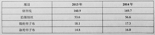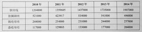 据橡胶工业协会骨架材料专业委员会对30家主要会员企业统计,2014年,钢帘线产量190.7万吨,胎圈钢丝49.6万吨,锦纶帘布25.7万吨,涤纶帘布20.4万吨。